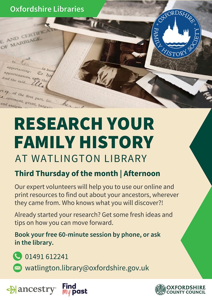 We are delighted to welcome Kevin Poule from the Family History Society to the library for his popular one-to-one sessions. He will be in the library on the 3rd Thursday afternoon of each month and is available to help with family research online. If you would like to book one of these free, one- hour sessions please ring the library on 01491 612241.