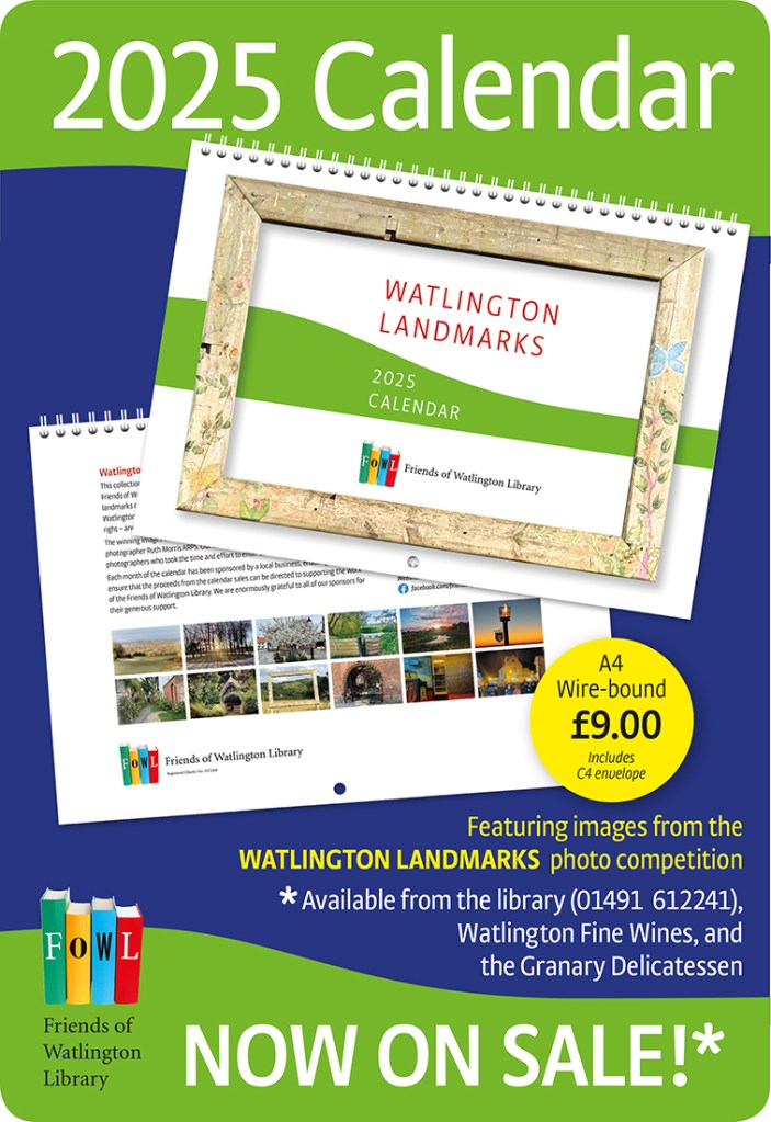 Our 2025 calendar, Watlington Landmarks, costs just £9, complete with sturdy envelope, and is now available from the library, The Granary Deli and Watlington Fine Wines.