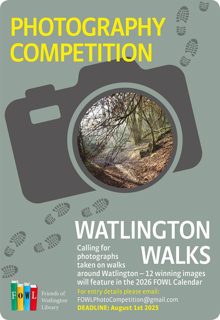 Have you been talking pictures? The photography competition for next year’s calendar is now open and the theme is Watlington Walks. You can interpret this in any way you choose; what images encapsulate your favourite walk in and around Watlington and its surrounding villages? It is entirely up to you.